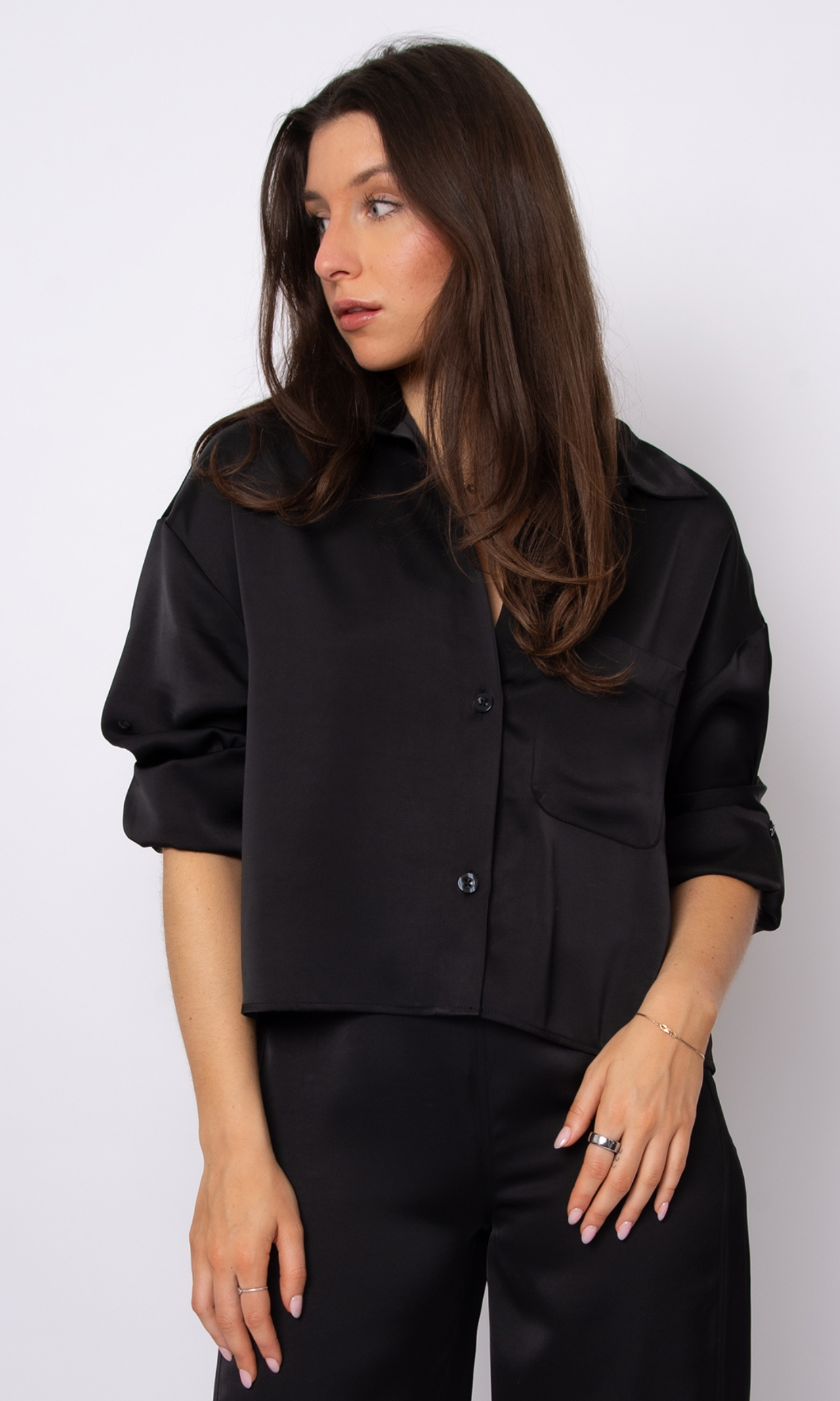 Why we picked it: The Kerwin Crop Shirt is our definition of sleek minimalism with a touch of edge. Crafted from a smooth satin fabric that drapes effortlessly, this shirt brings instant polish to any outfit. The cropped silhouette feels modern and fresh, while the relaxed fit keeps it easy and wearable. With its single chest pocket, button-up front, and soft sheen, it’s a timeless piece that transitions seamlessly from day to night. Whether styled with denim or the matching satin pants, it’s an instant outfit upgrade.