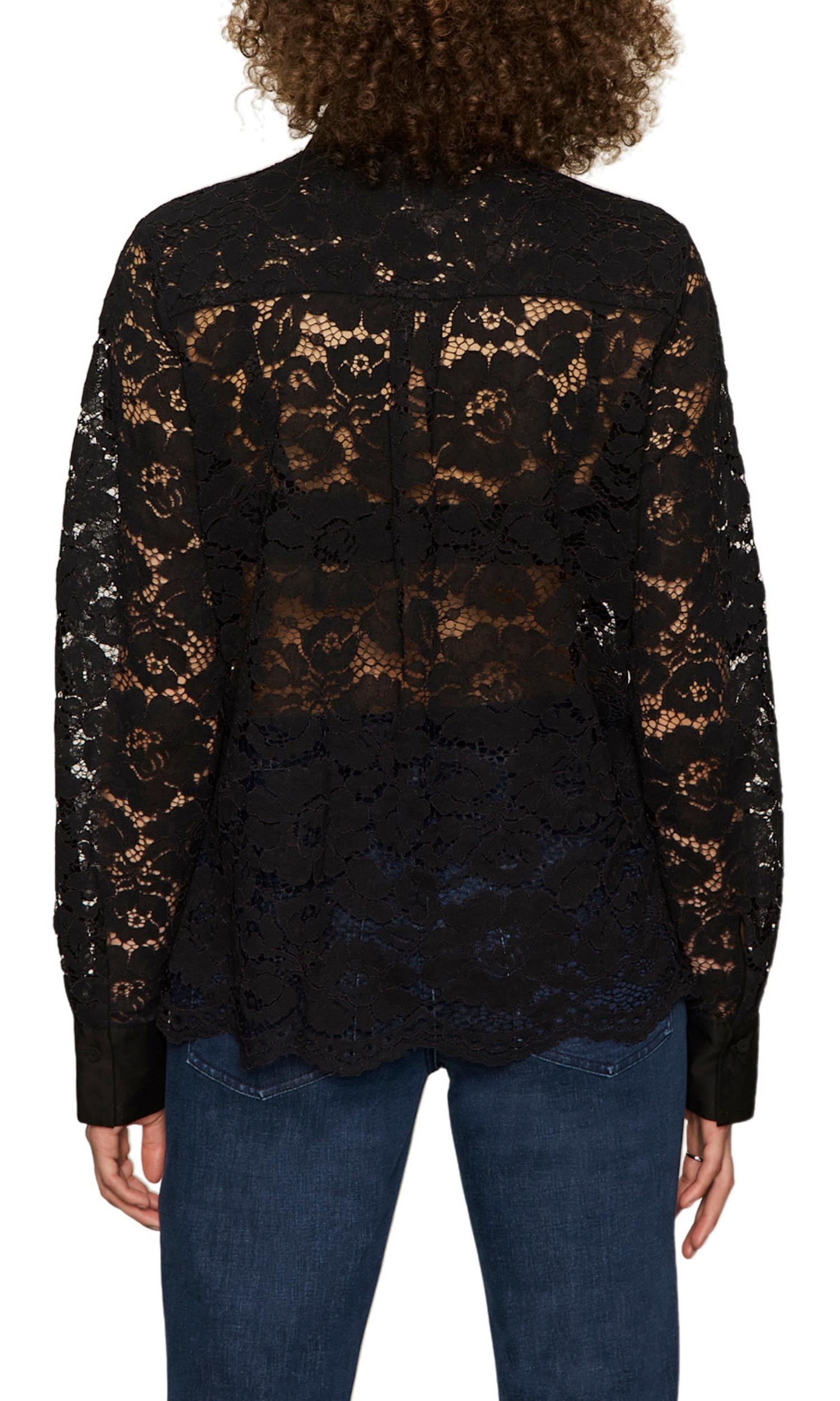 A timeless tuxedo shirt, reimagined with sheer floral lace and elegant structure. This piece blends polished tailoring with a sultry edge, thanks to its pleated front placket, crisp collar, and beautifully detailed lace sleeves and back. Feminine, modern, and just the right amount of daring—it's your elevated holiday staple.