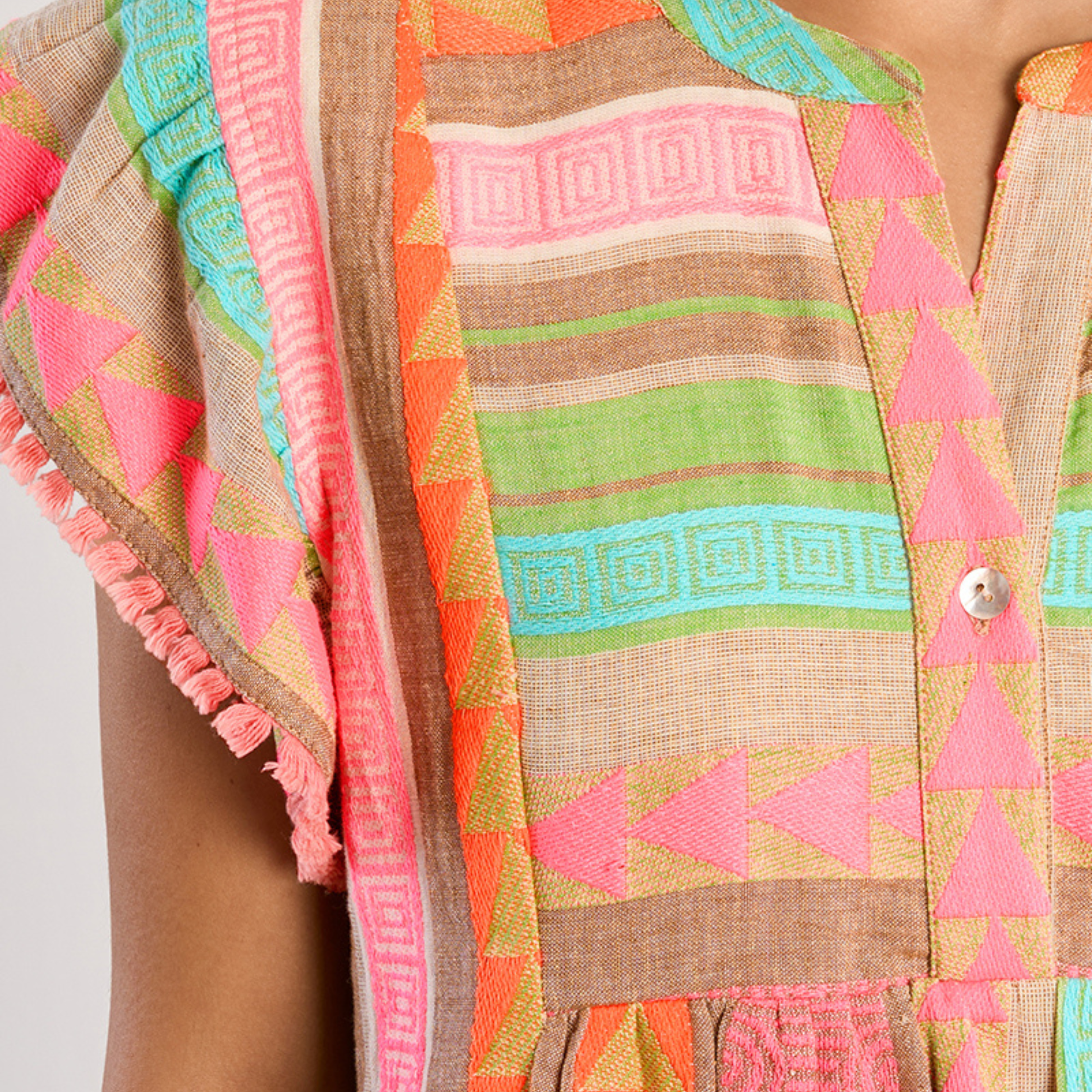Why we picked it: If this dress doesn't make you smile, we don't know what will. The multicolour geometric and stripe print is so joyful — neon pink, orange, turquoise, lime green, and gold all mixed together in the most fun, eye-catching way. It's bold, it's happy, and it's exactly the kind of piece that makes summer dressing feel exciting again. The relaxed babydoll silhouette is super comfortable and flattering, the V-neck with button detail keeps it feeling a little polished, and those little fringe details on the sleeves? Such a cute finishing touch that adds just the right amount of playfulness.