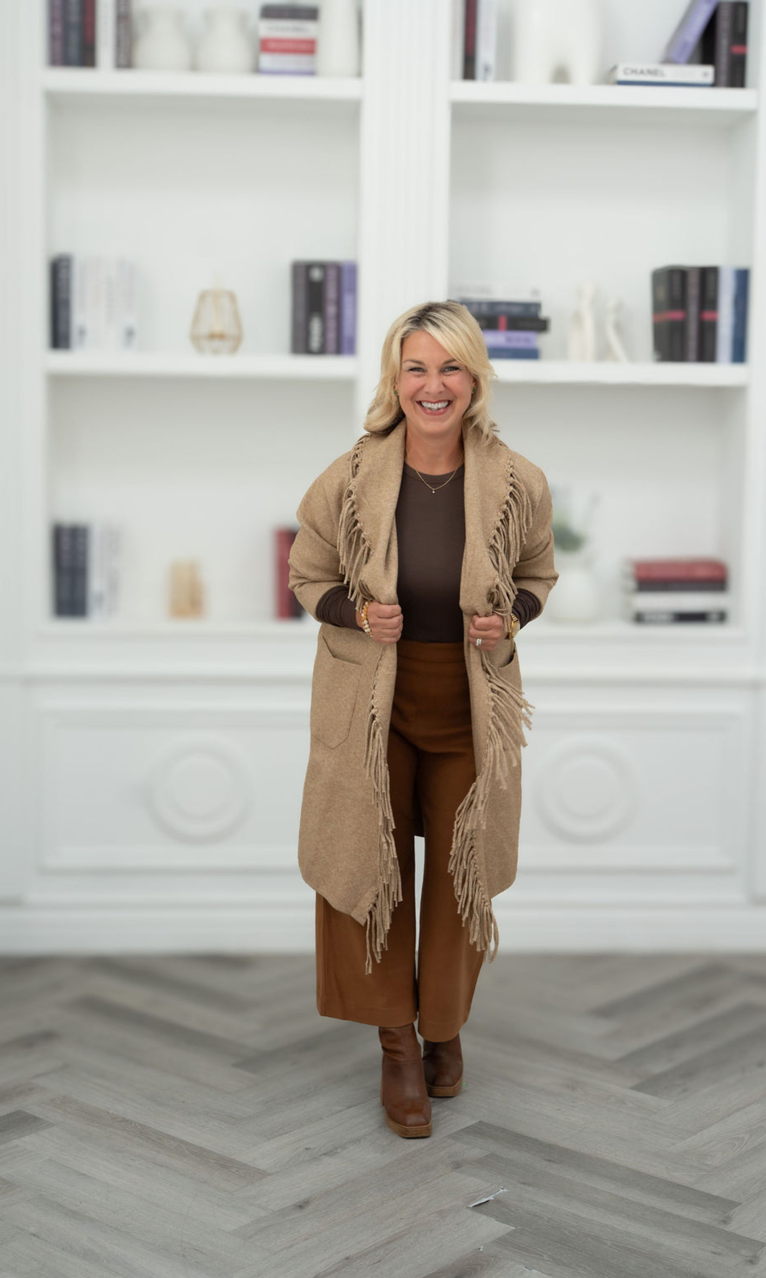 Fit: Ziggy has that perfect relaxed-but-intentional silhouette. Slightly oversized through the body for easy layering (yes, even over chunkier knits), while the structured shoulders keep it from feeling too slouchy. The open-front design lets you style it loose or belted—your call. The hem hits mid-thigh to just above the knee, depending on your height—ideal for elongating your frame and balancing proportions. And the fringe? It adds subtle movement and vertical interest. Hello, lengthened silhouette.